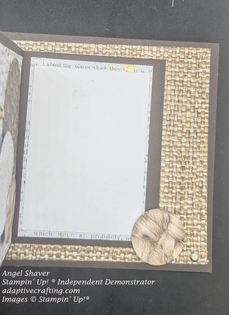 Card is a Double Z-Fold Fun Fold with different patterns from the Woven Textures DSP decorating each of the panels on the card base or back z. The smaller front z is decorated with paper from the Nature’s Sweetness DSP.