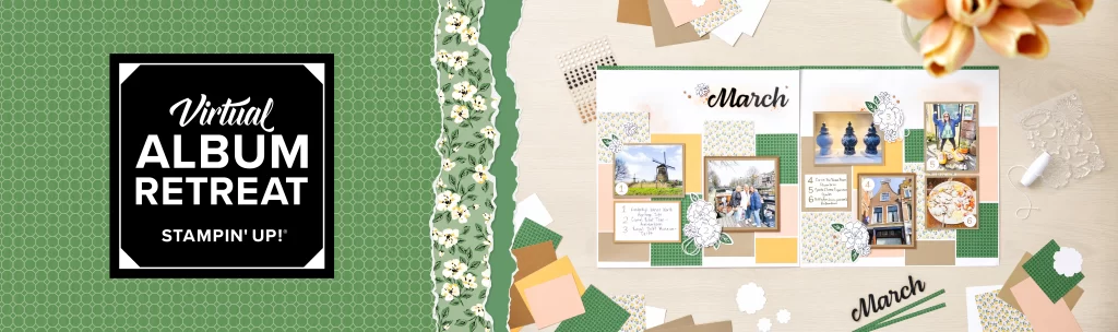 Stampin’ Up!® Virtual Album Retreat coming in July. July 16-18, 2025. No registration necessary. When you order the Month by Month Virtual Retreat 2025 kit, you will receive an invite to the exclusive Facebook group where the event will be live streamed from 2:00-10:30pm MT each day July 16-18. Video recordings will be available in the exclusive FB group following the event. Order your kit which includes exclusive stamp sets, designed precut sheets, cardstock, embellishments, and more to make 12 2-page layouts.