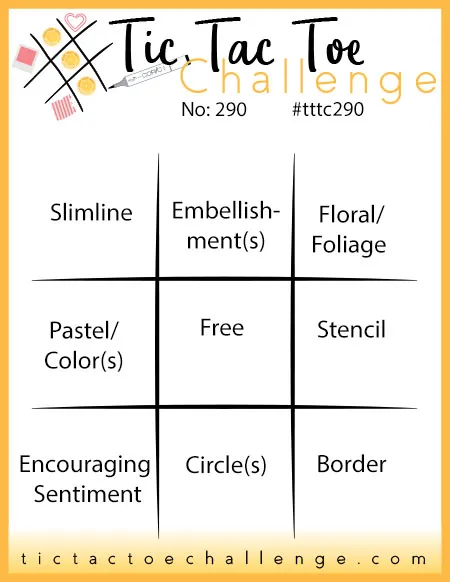 This card was entered in the As You Like It: Simple or Fussy challenge. I would say I tend to like things more simple. I don’t want the focal point to get lost in a ton of extra layers, embellishments, etc. I want the theme and purpose of the card to be instantly recognizable. That being said, I do like to add something that makes the card unique. This card is a slimline and not your typical card shape and size. I’m also really fond of adding a few embellishments of the same type.